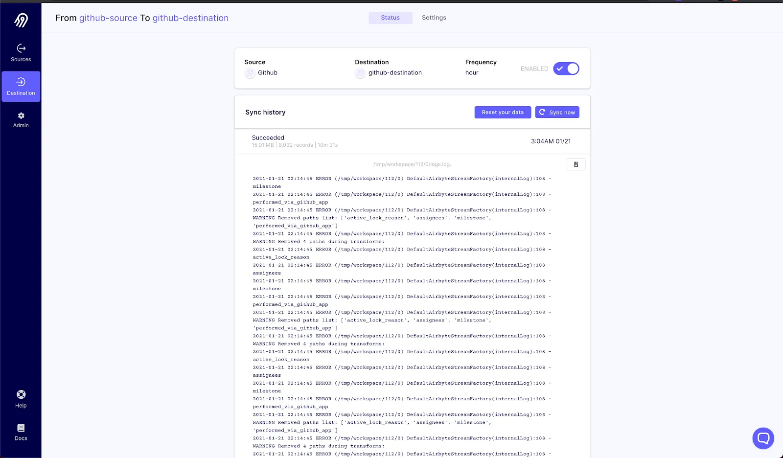 When done, you will see the status change from running to Succeeded. Also, the byte count will be referring to the byte of data Airbyte has pulled from GitHub into your Postgres database.