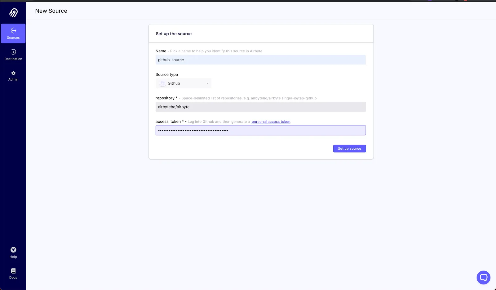 Enter the name github-source as the source name and click the drop down and select Github connector as source type. After selecting the GitHub source type, you will be presented with two text boxes.The first is to enter a repository you want. In this box, type in airbytehq/airbyte, and then, in the second box, you will need to provide a GitHub access token which you can obtain from here.