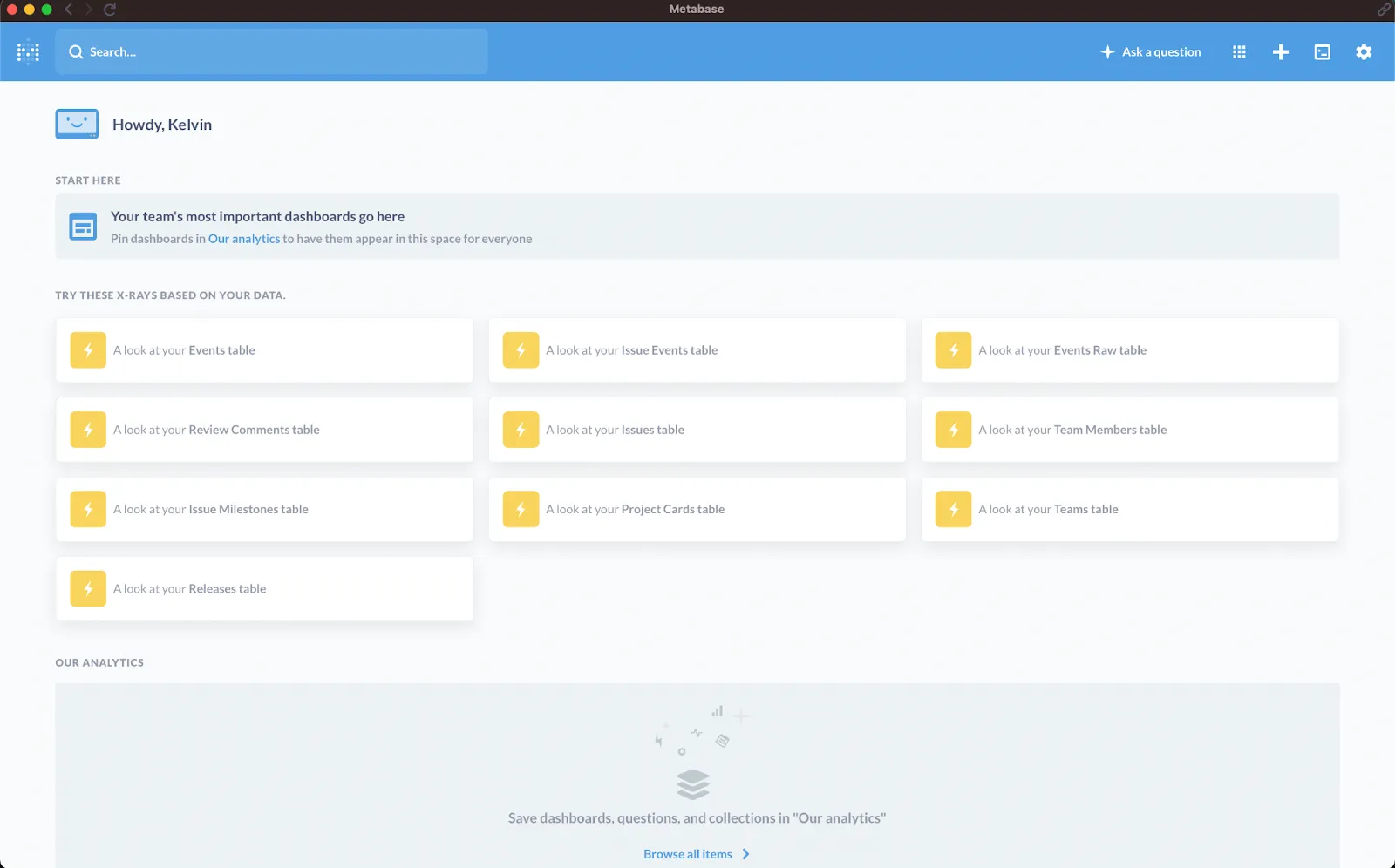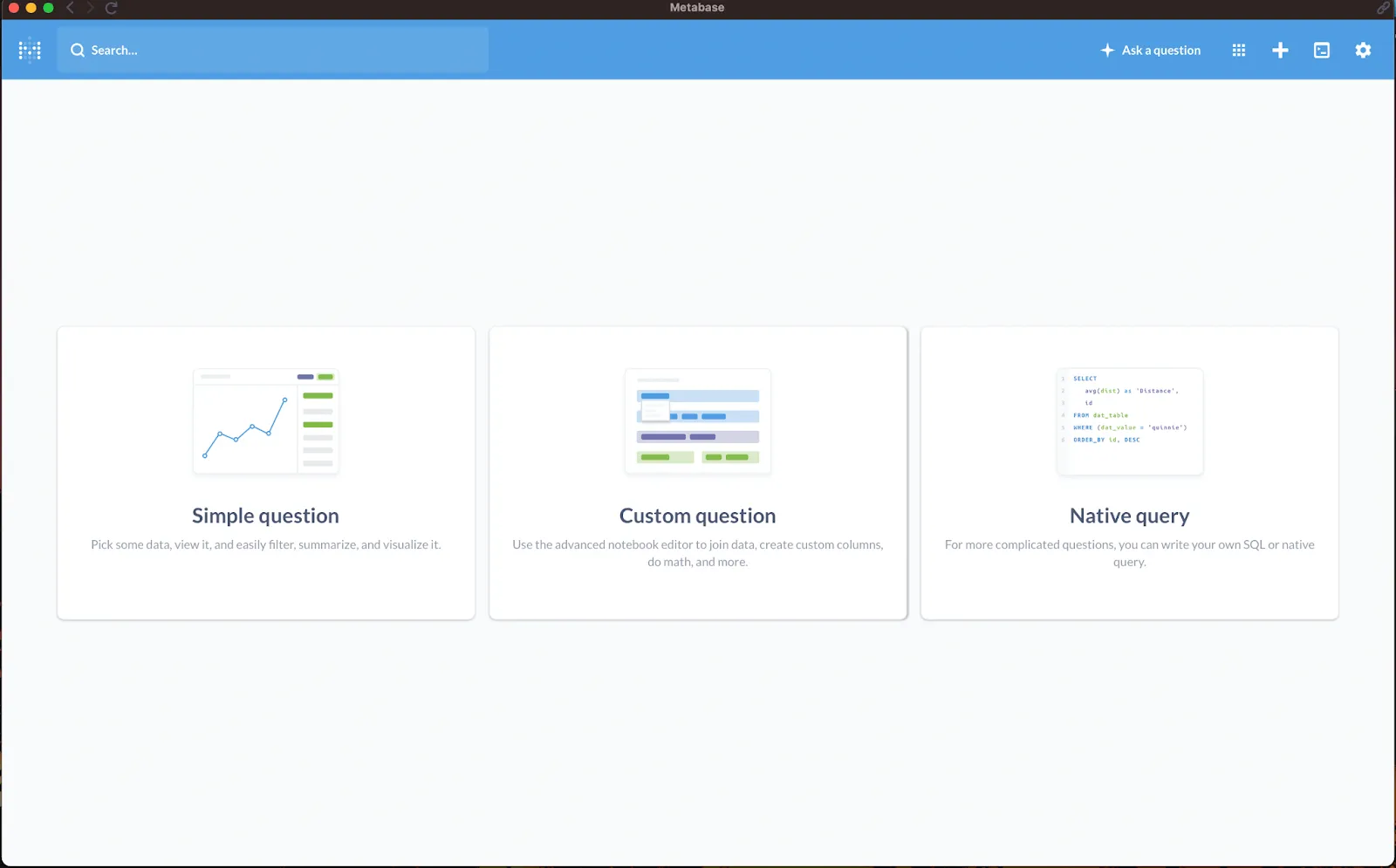 Metabase is an open source analytic tool that you can get started working with in a couple of ways; using the .jar file, installing it as a Mac app or using a Docker container.