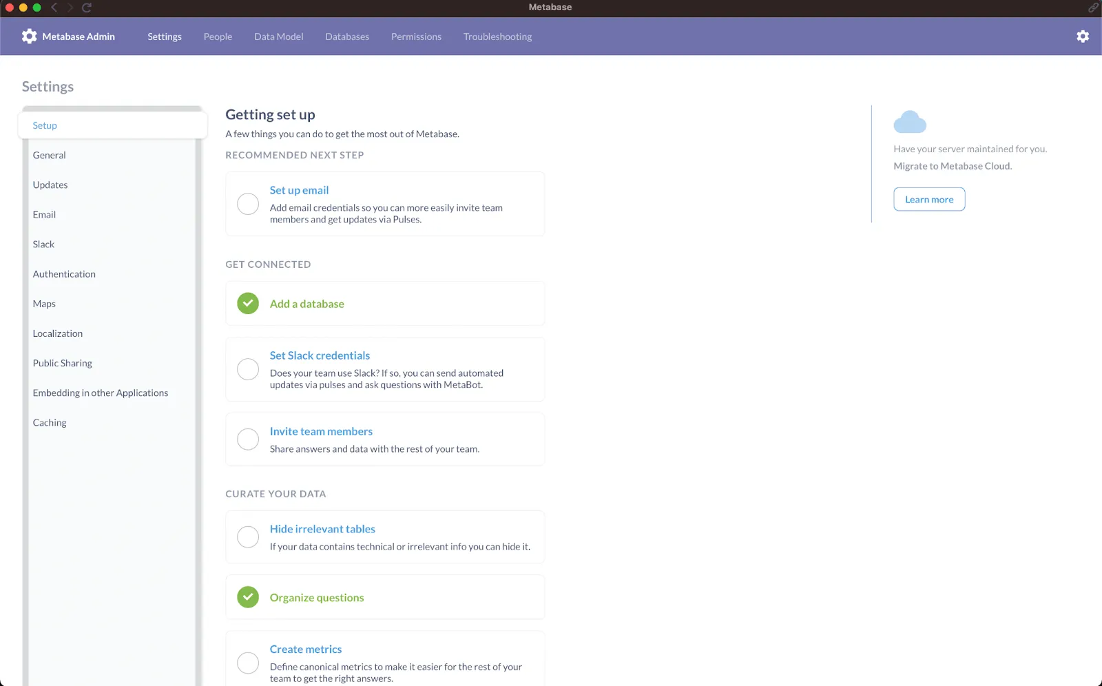 If you are on a Mac, you can download the Metabase app from here. Before downloading, ensure your Mac has enough space. If needed, you can clean Mac to free up laptop storage. After download, launch the app and complete registration for an account and you will see the Metabase dashboard: