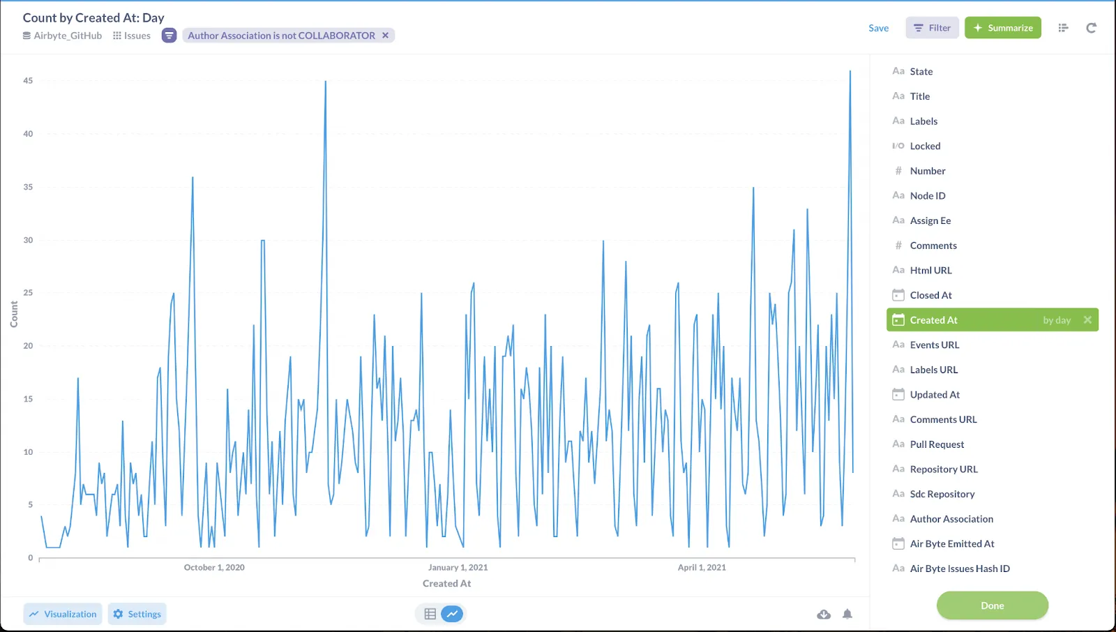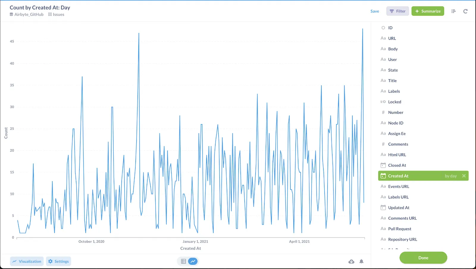 In this article, we have worked through getting data from a GitHub repo using the GitHub Airbyte connector and storing that data in a PostgreSQL database. We then set up Metabase and asked questions to visualize the data.