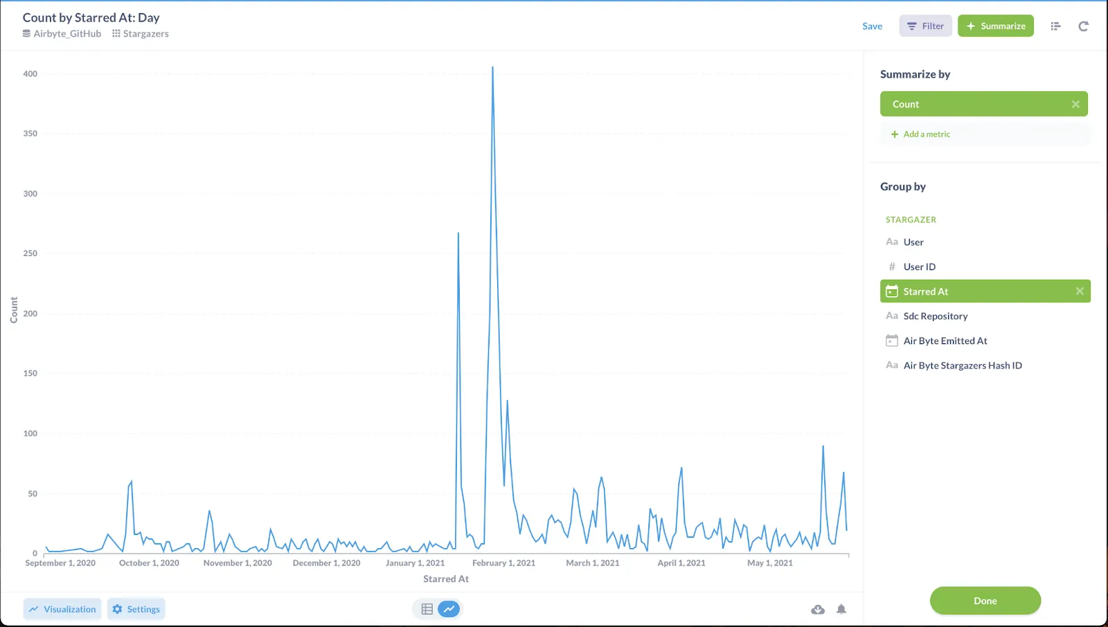 To compute the answer to our first question, hit the Summarize button and group by Starred At and summarize by Count and then you’d have your very first question answered: the number of new stargazers in a day.