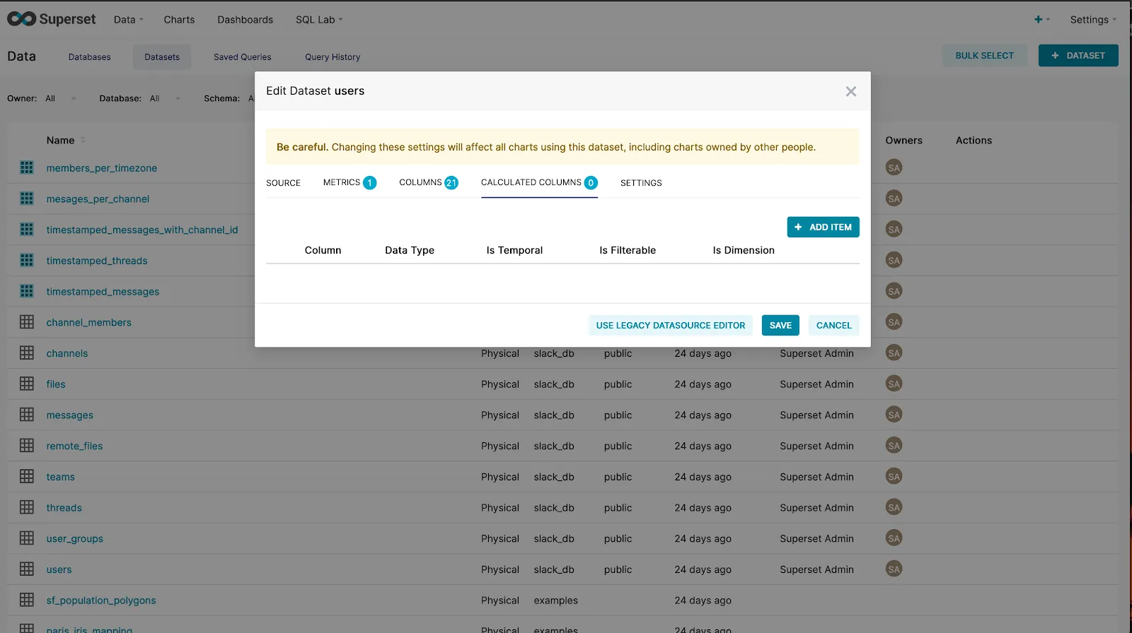 To get this, we will first click on the users’ dataset of our slack_db on the Superset dashboard.