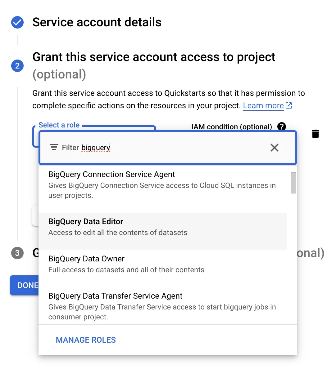 Assign the “BigQuery Data Editor” and “BigQuery Job User” roles. These roles enable the service account to modify data and execute jobs in BigQuery.