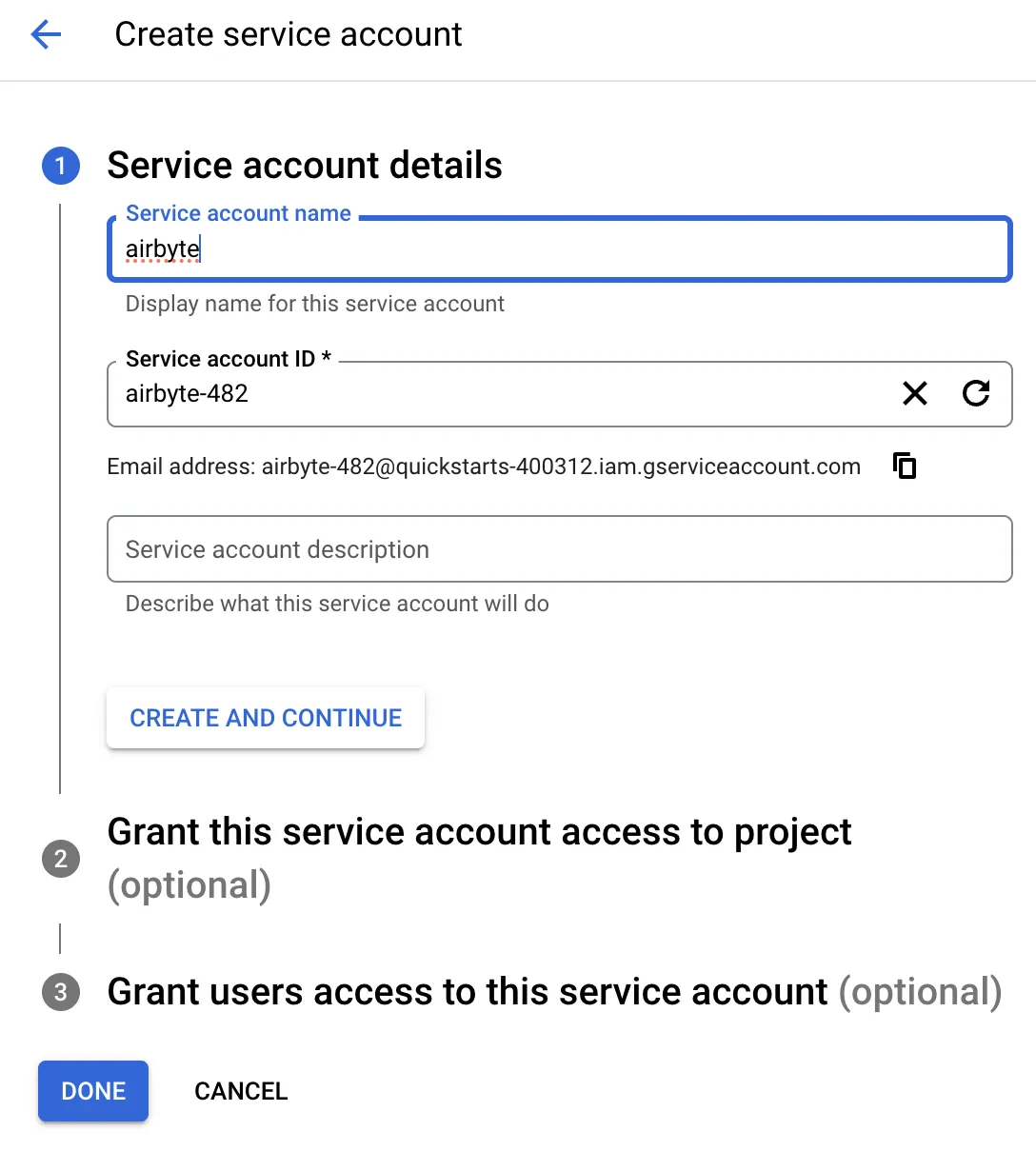 Name your service account (one for Airbyte and one for dbt) and proceed to “Create and continue”.