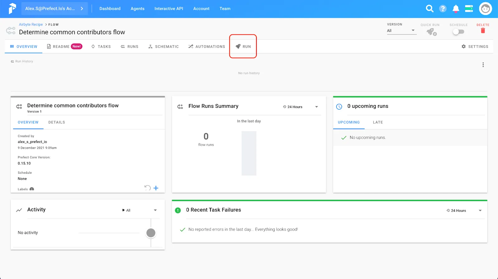 To run our flow, navigate to the flow page and hit the Run button:
