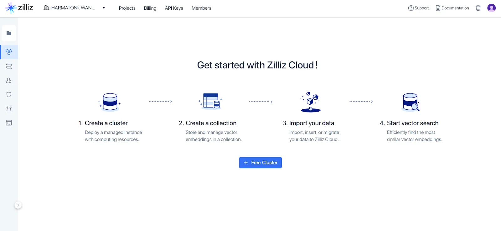 To get started with the Zilliz database, create a new cluster and a collection within it. Navigate to the API keys page and copy the api key for pasting into airbyte.