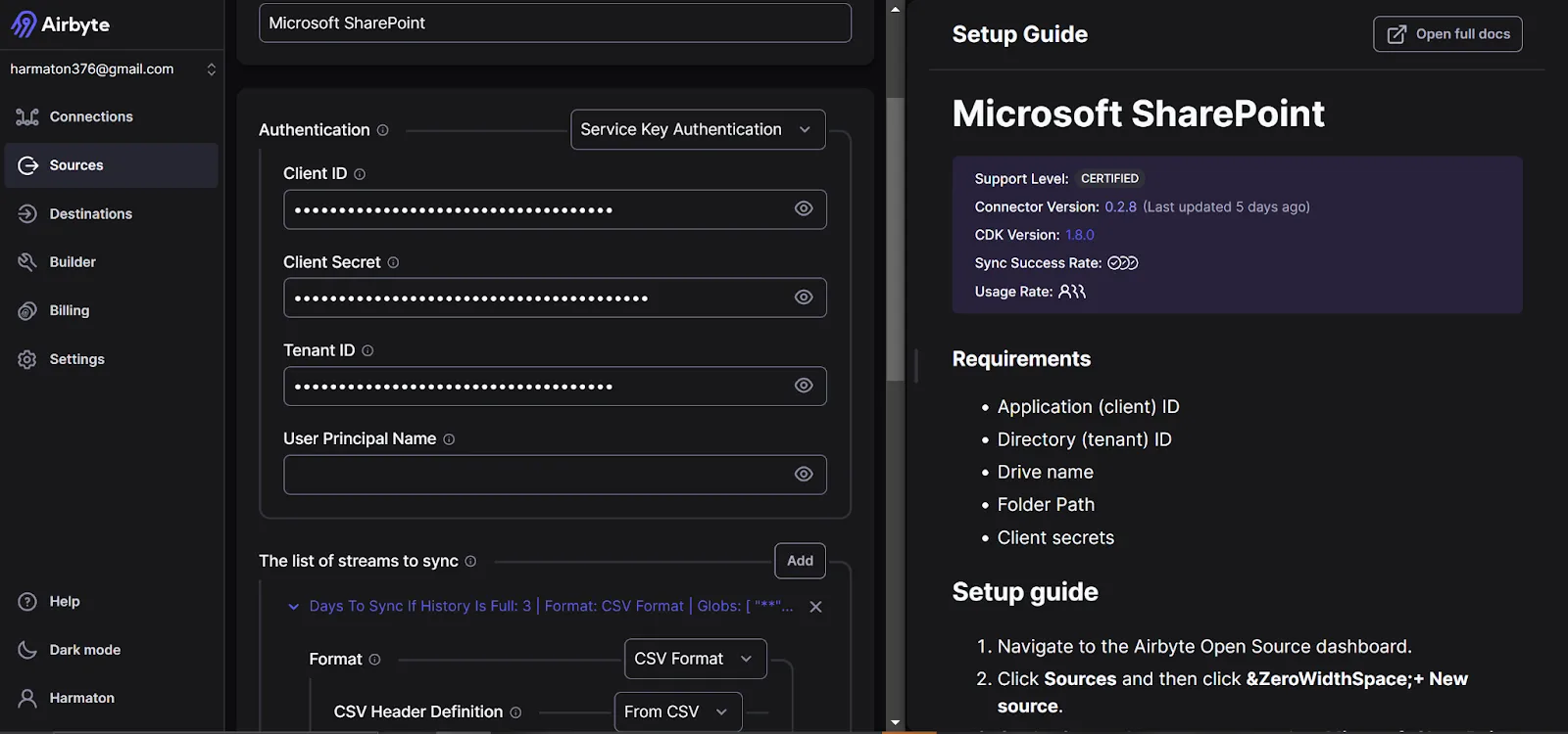 Navigate to the airbyte Airbyte cloud dashboard, click sources then select Microsoft Sharepoint as your source from the source options. You require the following :