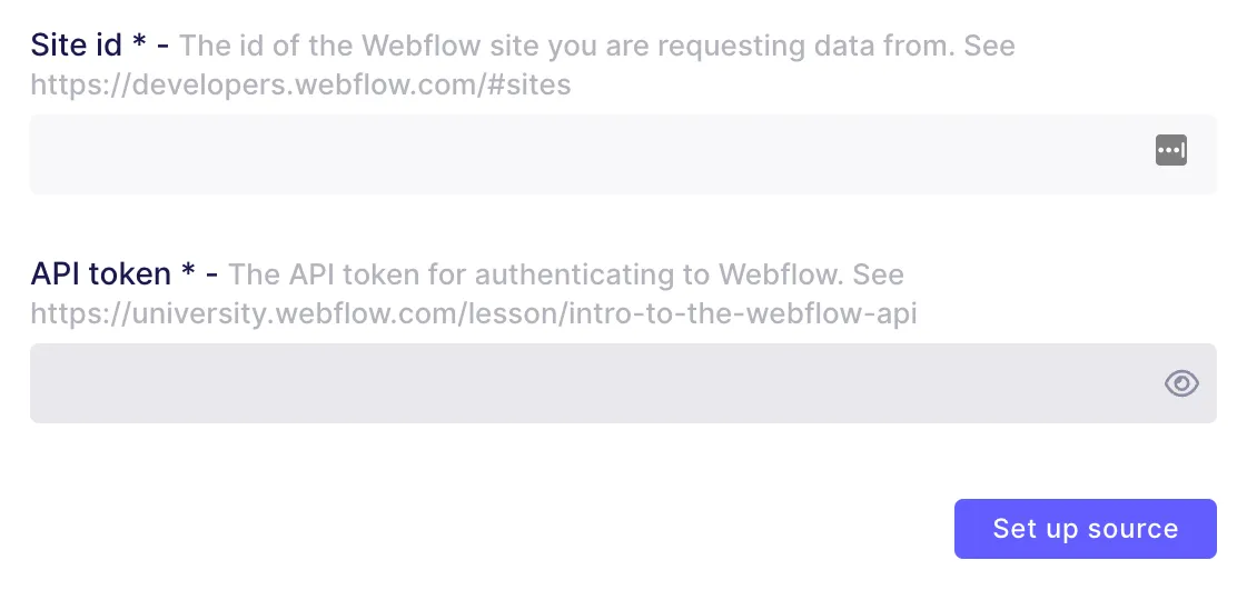 There are two input parameters: site_id, and api_key – you can obtain the values corresponding to your Webflow CMS as described in the Webflow source documentation.