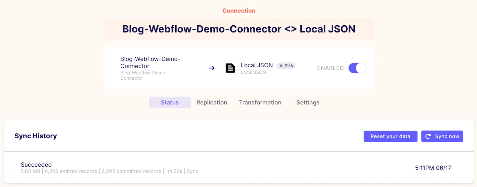This tells Airbyte to output json data to /tmp/airbyte_local/webflow-blog-test. You will then be presented with a screen that allows you to configure the connection parameters as follows: