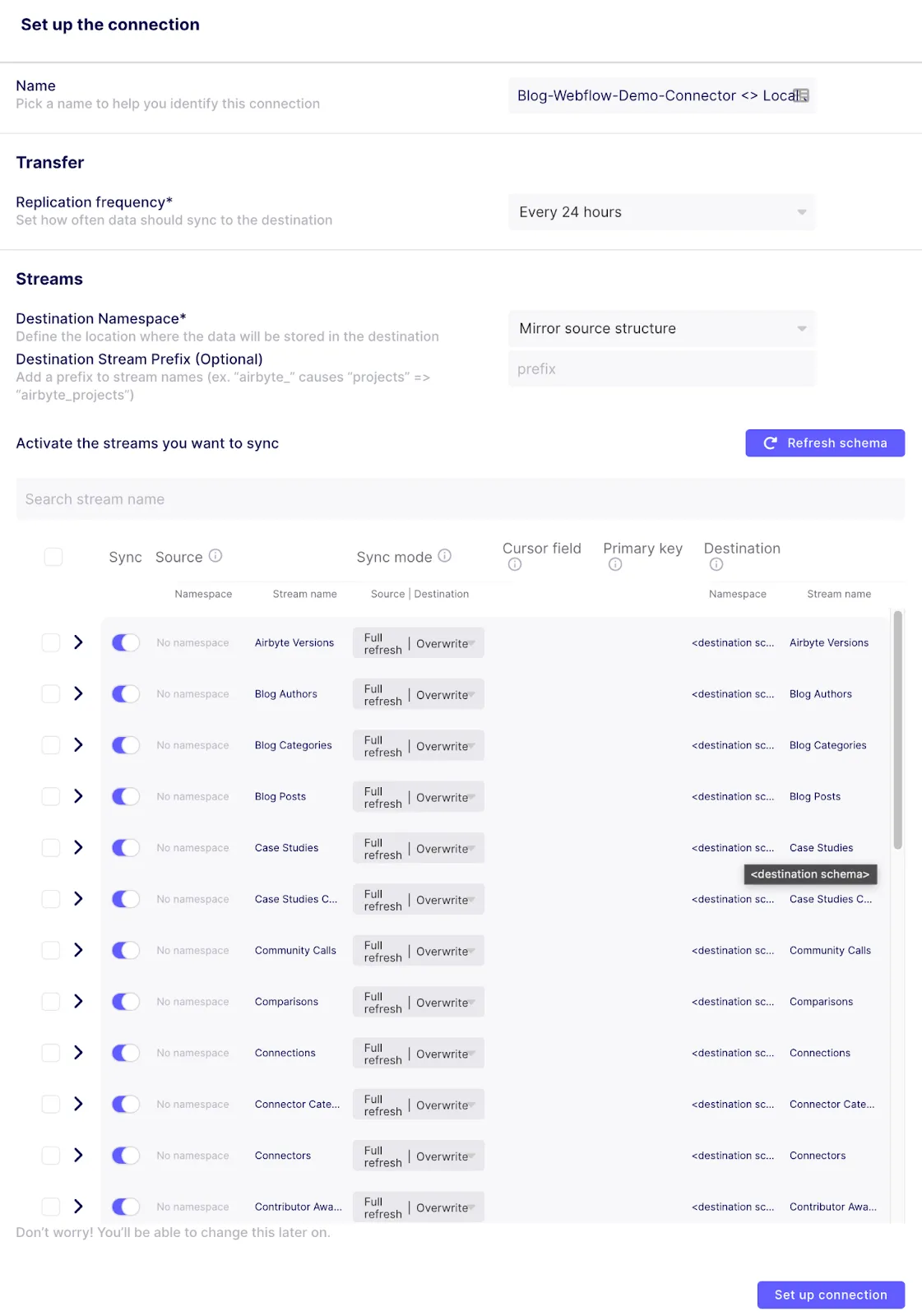 Notice that there are many stream names available, all of which were dynamically generated based on the collections that are available in Webflow. Using the switch on the left side allows you to specify which of these streams you are interested in replicating to your output. For this demonstration, you may leave all settings with their default value, and then click on the Set up connection button in the bottom right corner.