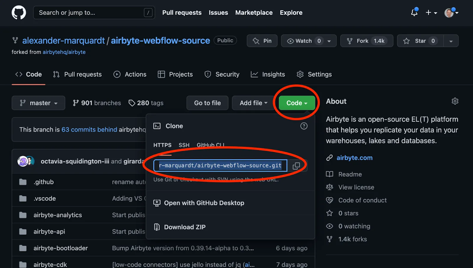 Next, create a fork of Airbyte’s repository. Go to https://github.com/airbytehq/airbyte, and select the fork button as demonstrated in the image below.