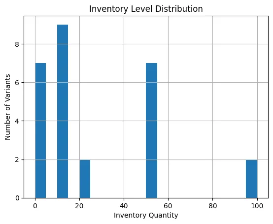 # Variant Price Range Analysis product_variants['price'] = pd.to_numeric(product_variants['price'], errors='coerce') product_variants['price'].hist(bins=20) plt.title('Product Variant Price Distribution') plt.xlabel('Price') plt.ylabel('Number of Variants') plt.show()