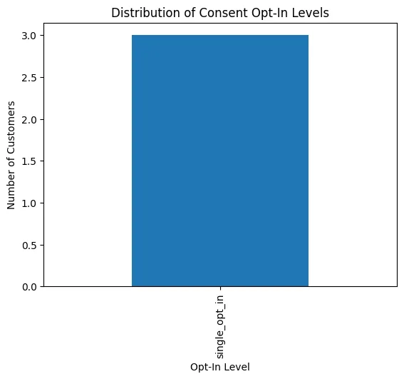 # Opt-in level distribution opt_in_level_counts.plot(kind='bar') plt.title('Distribution of Consent Opt-In Levels') plt.xlabel('Opt-In Level') plt.ylabel('Number of Customers') plt.show()