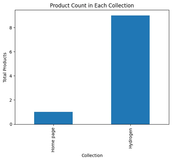 collections['products_count'] = pd.to_numeric(collections['products_count'], errors='coerce') collections.groupby('title')['products_count'].sum().plot(kind='bar') plt.title('Product Count in Each Collection') plt.xlabel('Collection') plt.ylabel('Total Products') plt.show()