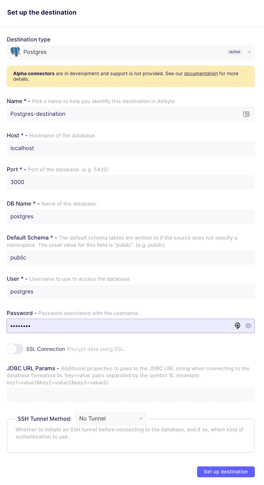 To drive data into the Postgres database that you created earlier, you will first need to define a destination. Configure an Airbyte destination destination called Postgres-destination as follows: