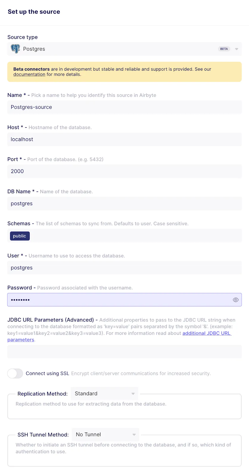 An Airbyte source will be used in your Airbyte connection(s) to retrieve data from the source database that you have just populated. Create a Postgres source called Postgres-source, as shown below: