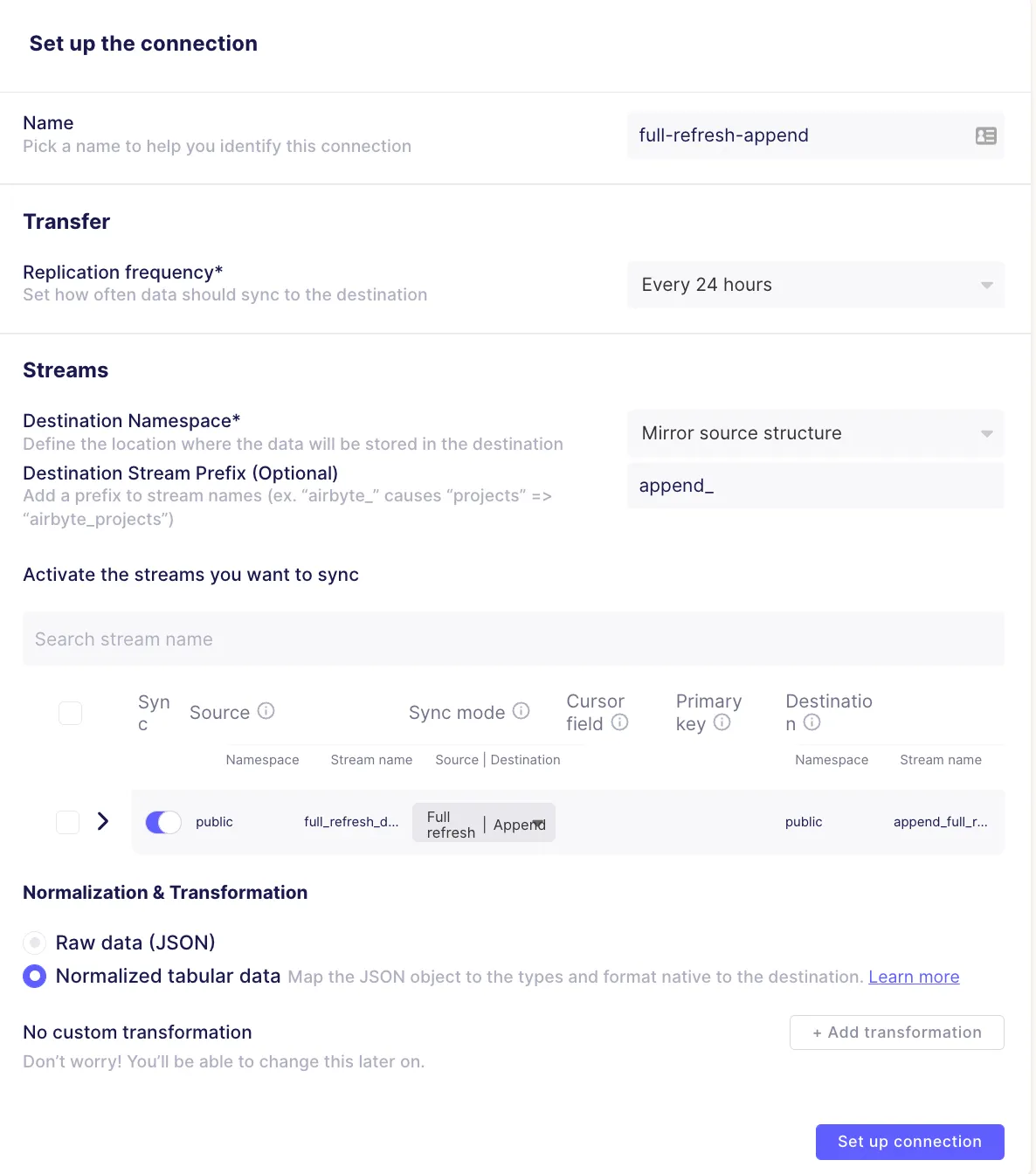 You will see a set up page as shown below. Set the name of the connection to full-refresh-overwrite, and the destination stream prefix as overwrite_ as shown below.