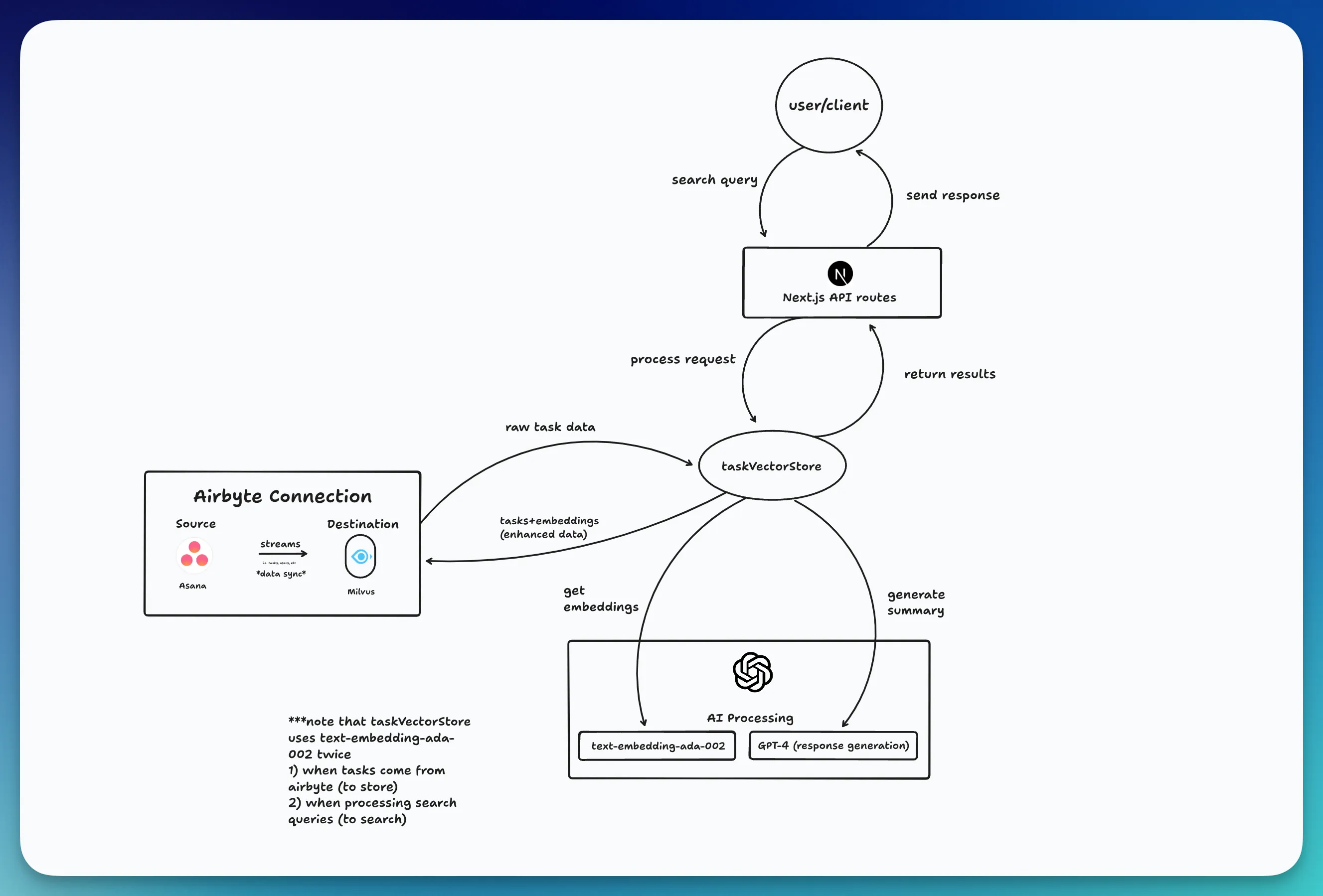 We are using task data from Asana, conducting a simple vector similarity search using the Milvus vector database, as well as Airbyte’s tooling to handle the data flow. Next.js is the main tech stack, as the API routes super easy to handle through App Router. With this, you can spin up a simple chatbot, with running one command (npm run dev