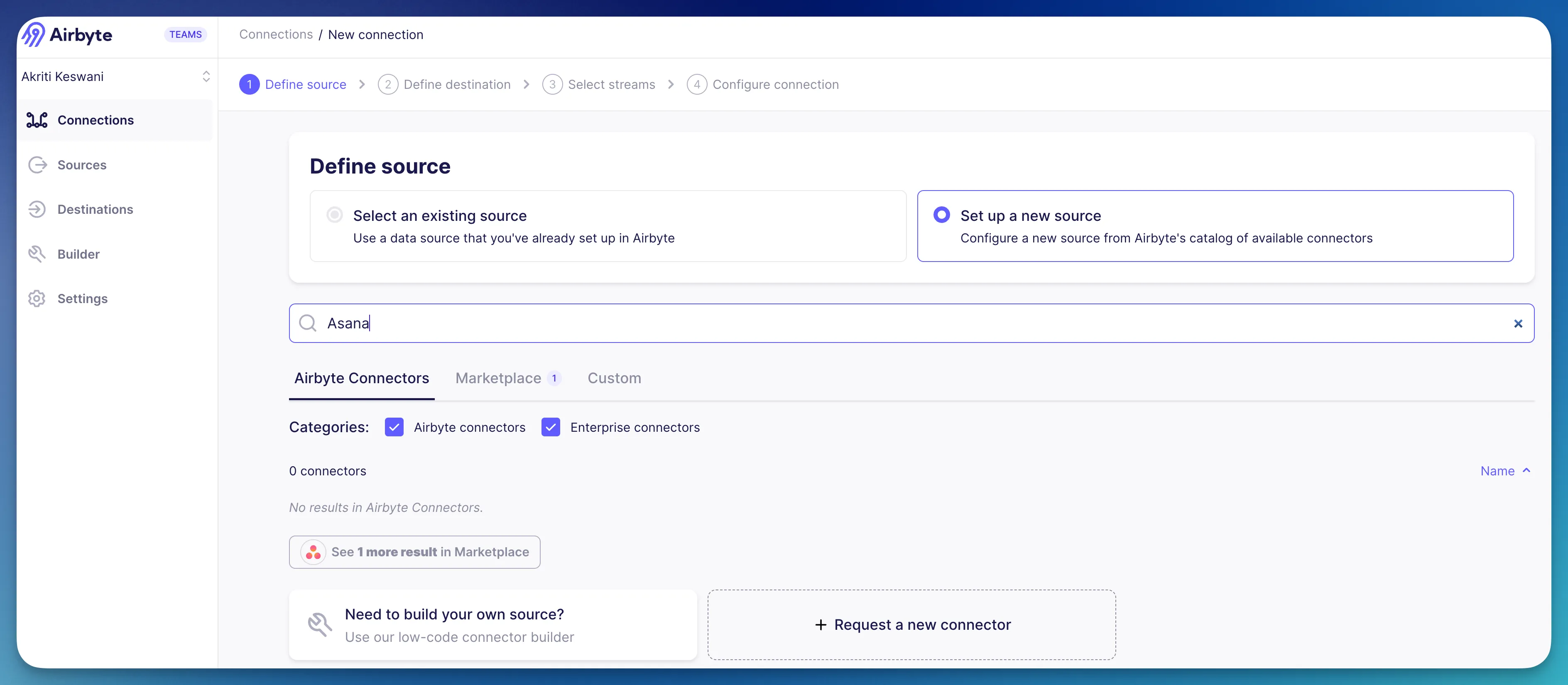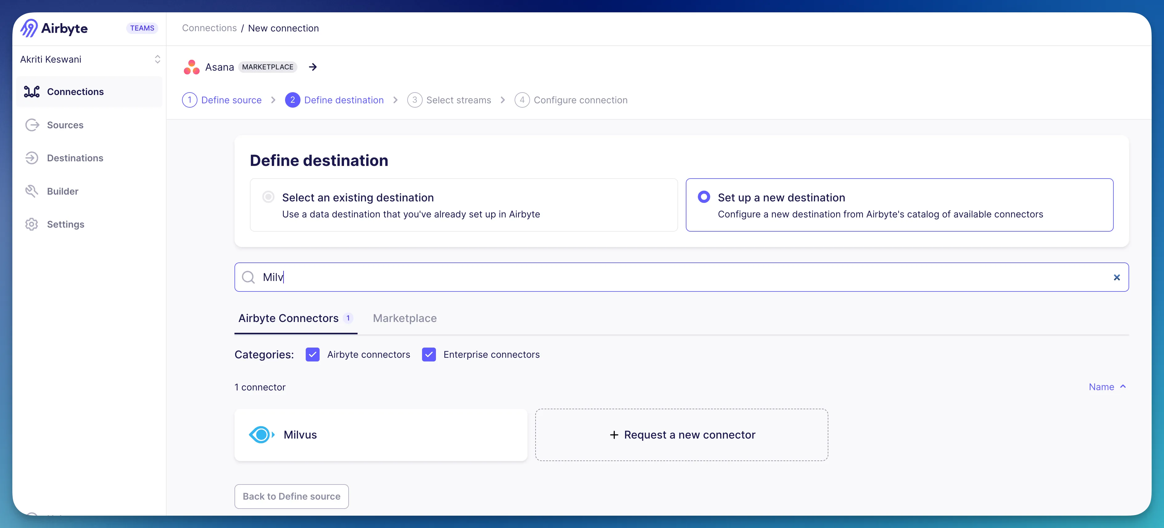 In the Airbyte Cloud UI, you should see Airbyte-related Milvus docs that would give you good context for this project. The next step is to just hit the purple "Set up destination" button and we can now select our relevant data streams. These represent the type of data you are trying to funnel from Asana to Milvus.