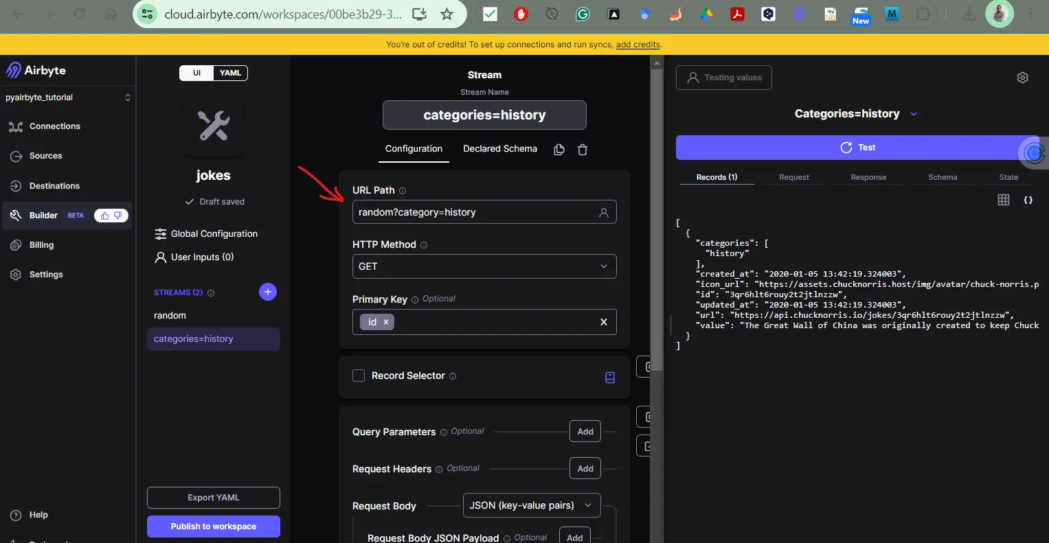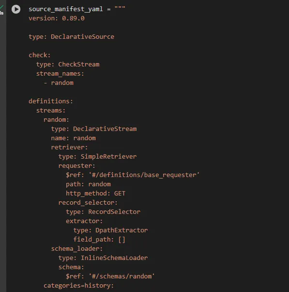 Following is the definition we will utilize in the Notebook, leveraging the new feature introduced by the Airbyte Team to execute declarative YAML sources with PyAirbyte. First, we will define the YAML specs in the Notebook (this is the YAML definition that we have downloaded from the Connector Builder UI), and then save our source_manifest_yaml source_manifest_dict: dict = yaml.safe_load(source_manifest_yaml) as a dictionary in the Notebook.