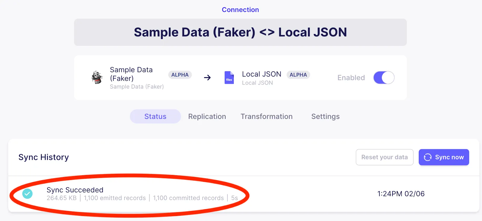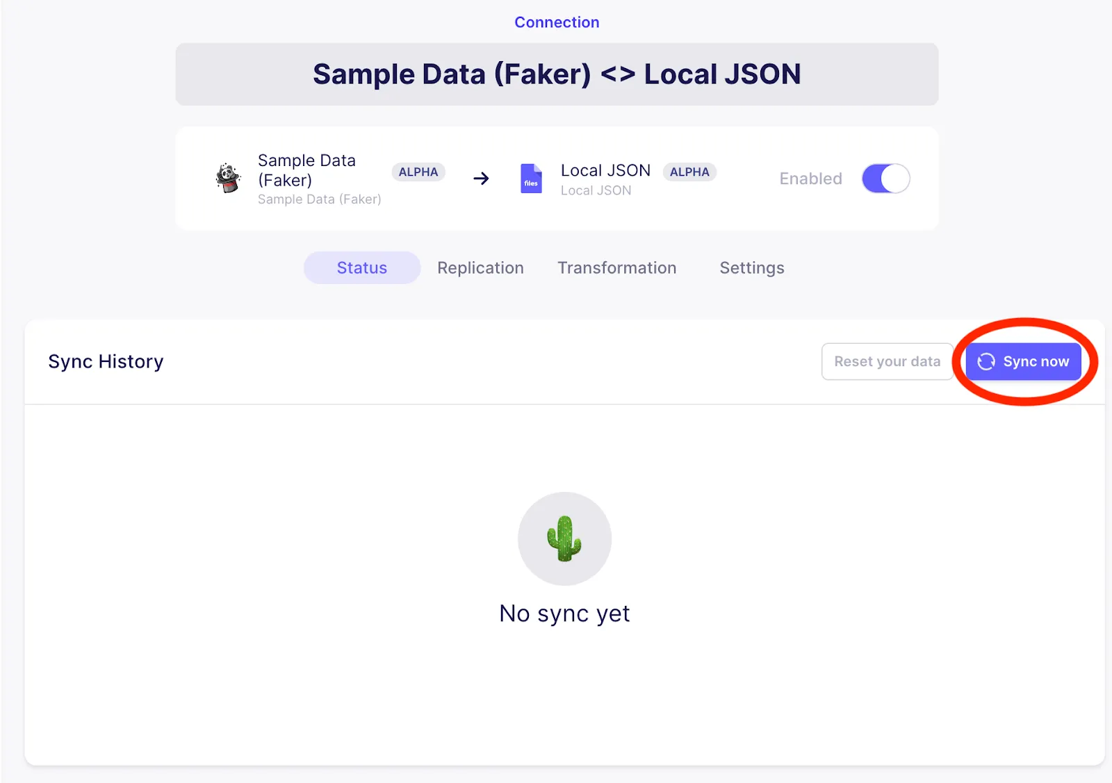 Trigger a sync from the Sample Data (faker) source to the Local JSON output by clicking on Sync now as highlighted in the image below.