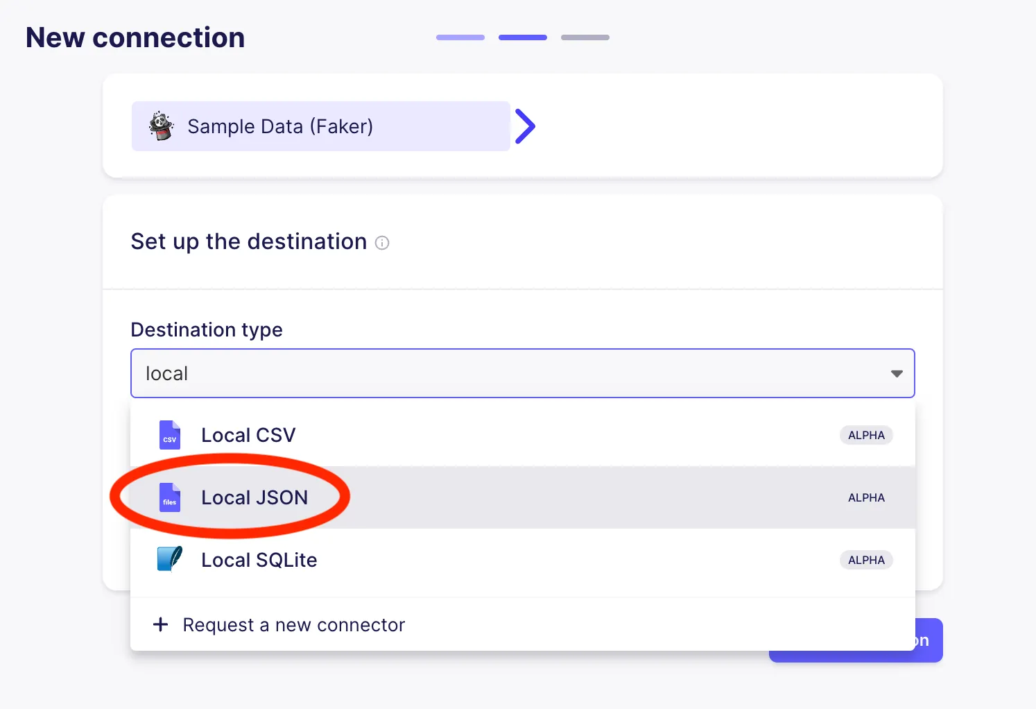 You will then wait a few seconds for the Sample Data source to be verified, at which point you will be prompted to configure the destination that will be used for the connection. Select Local JSON as shown below: