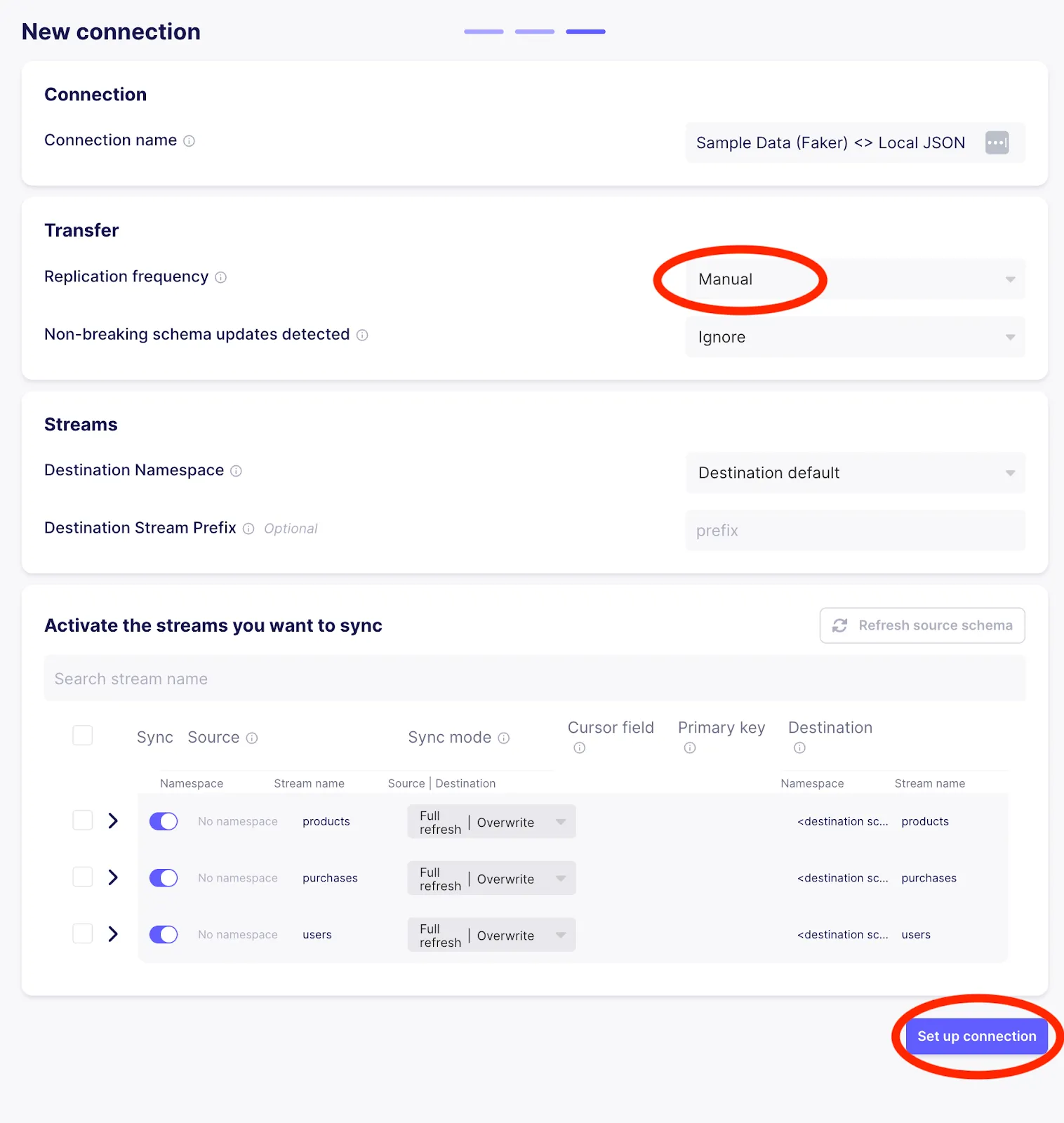 This will take you to a page to set up the connection. Set the replication frequency to Manual (since we will use Airflow to trigger Airbyte syncs rather than using Airbyte’s scheduler) and then click on Set up connection as highlighted in the image below.