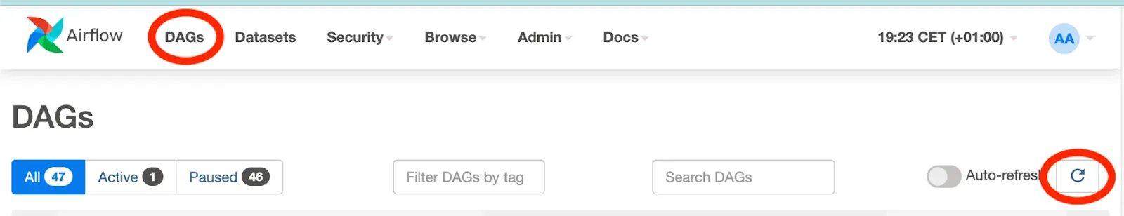In order to see the new DAG, click on DAGs on the top of the screen and then click on the refresh button highlighted below: