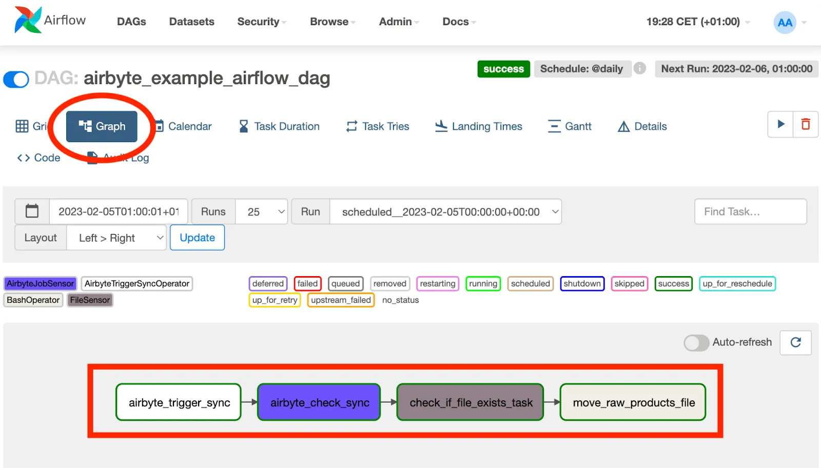The DAG that is specified by the above code can be viewed in Airflow by clicking on the Graph button that is annotated in the following illustration, and looks as follows: