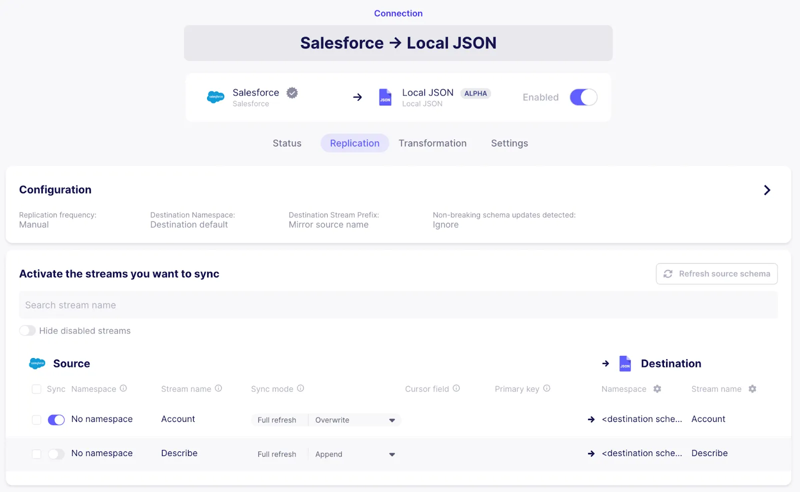 To keep things simple, only enable a single stream of records (in my case, I chose the “Account” stream from the Salesforce source)