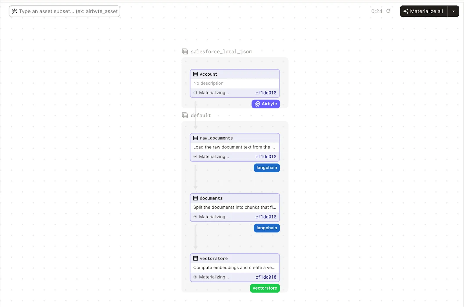 from langchain.document_loaders import AirbyteJSONLoader from dagster import asset, AssetIn