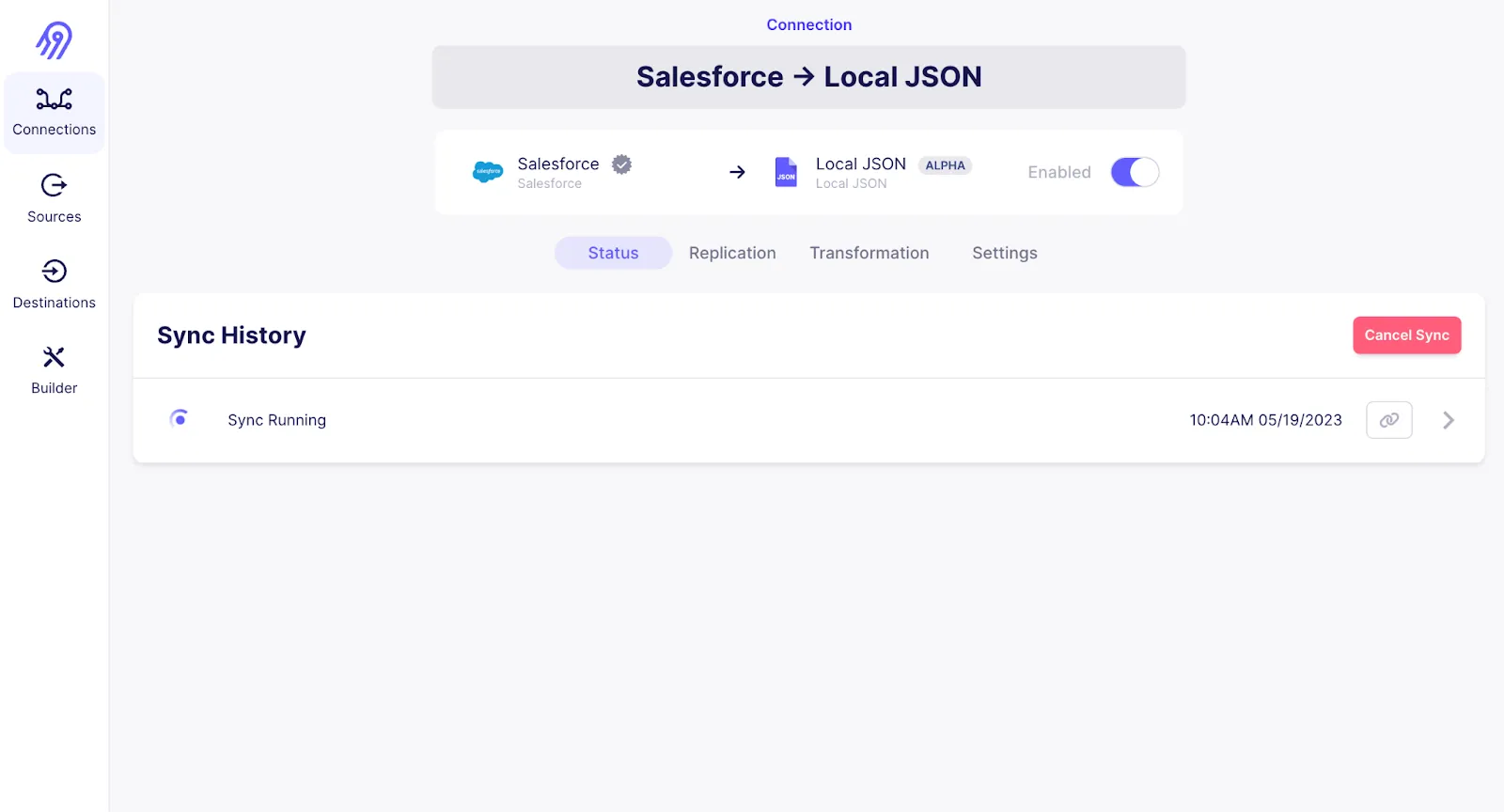 Configure a connection from your configured source to the local json destination. Set the “Replication frequency” to manual as Dagster will take care of running the sync at the right point in time.