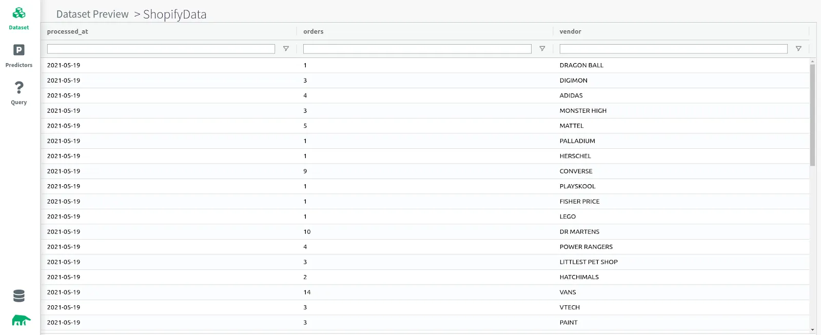 If you preview the data, you will see the number of daily orders grouped by vendor. The above example shows the orders for SHOES and TOYS stores. It groups the daily orders for the past 5 years for different vendors like NIKE, VANS, ADIDAS, LEGO, MATTEL, etc.