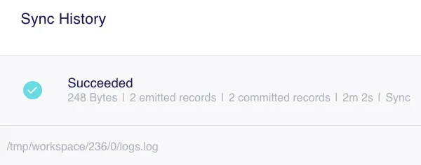 Execute a new sync by clicking on Sync Now in the connections UI and wait for the sync to complete. You should see a response indicating that one record has been emitted, as follows: