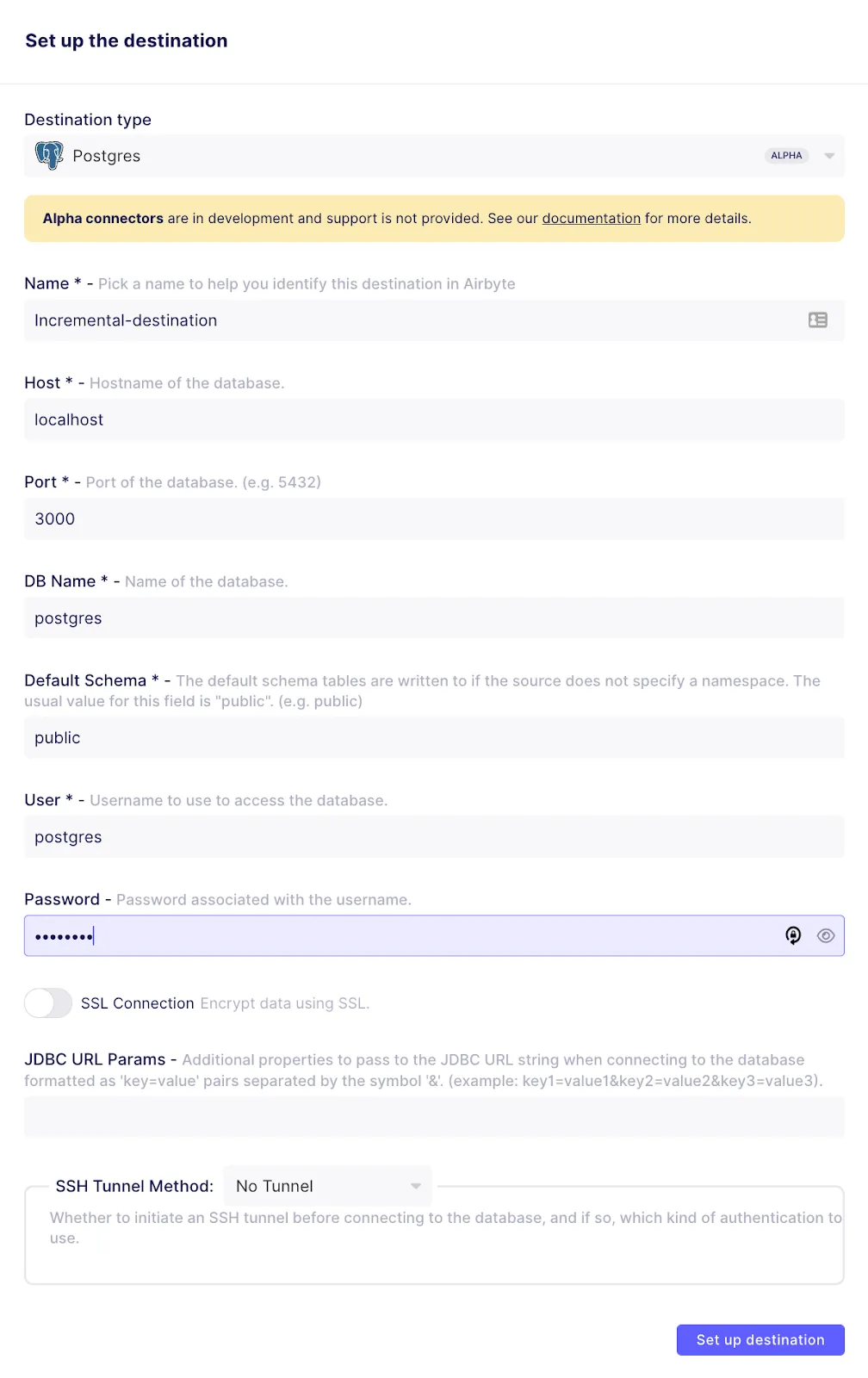 You will see a set up page as shown below. Set the name of the connection to incremental-sync-demo, and configure it as shown below: