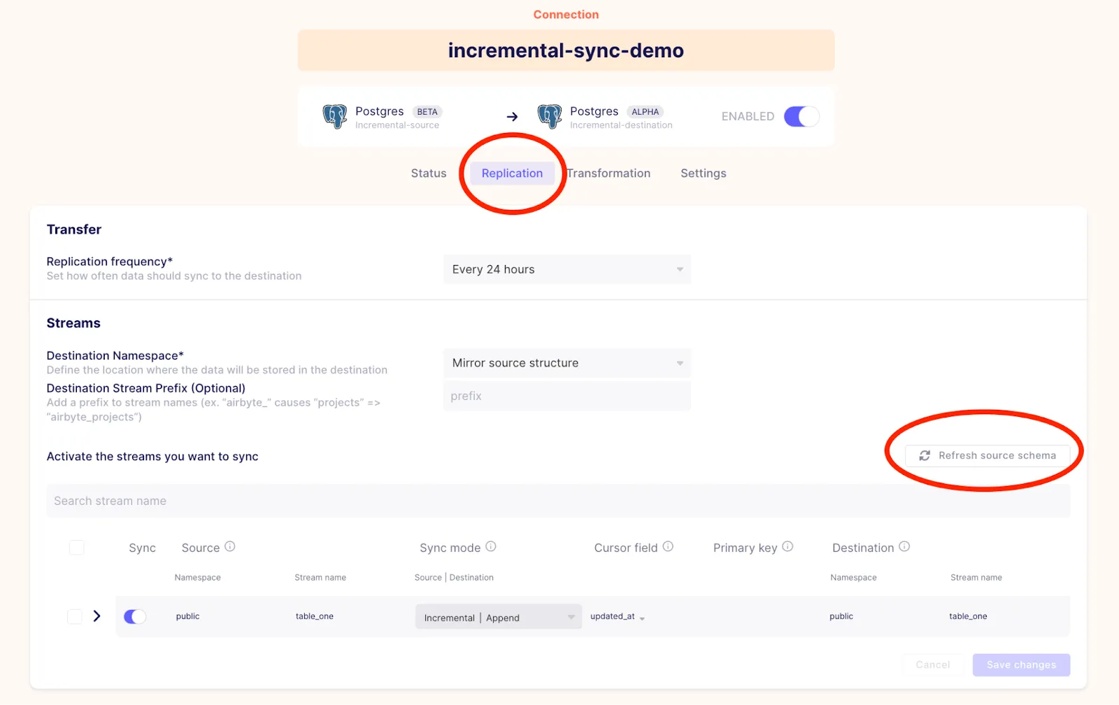 You will now configure Airbyte to detect the new table that you have just created. Do this by clicking on the Replication under the previously defined incremental-sync-demo connection, and then clicking on the Refresh source schema button as shown in the image below.