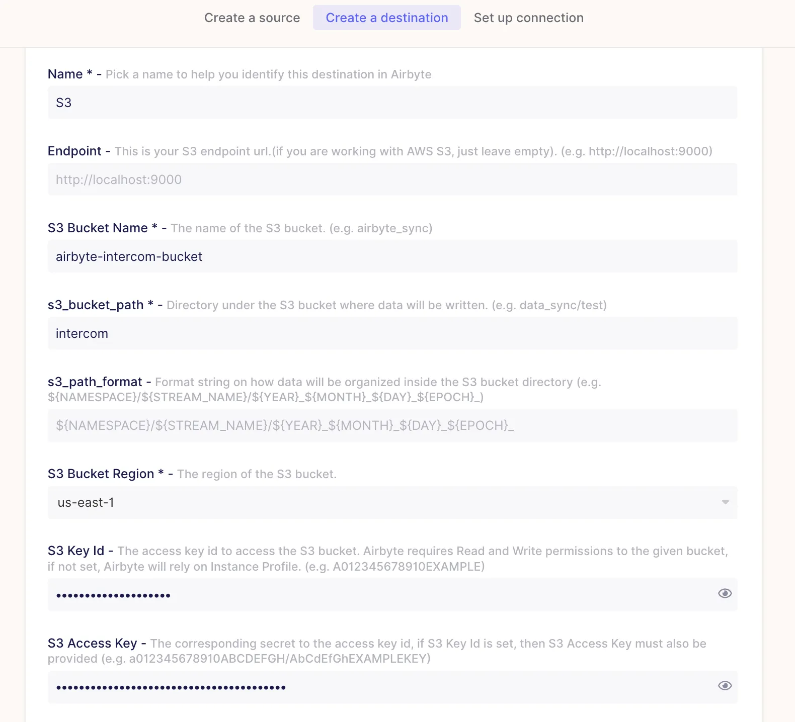 Once you have your access keys and your S3 bucket region, you can configure Amazon S3 as your Airbyte Cloud destination. As shown in the image below, choose S3 as the destination type and give it a name.