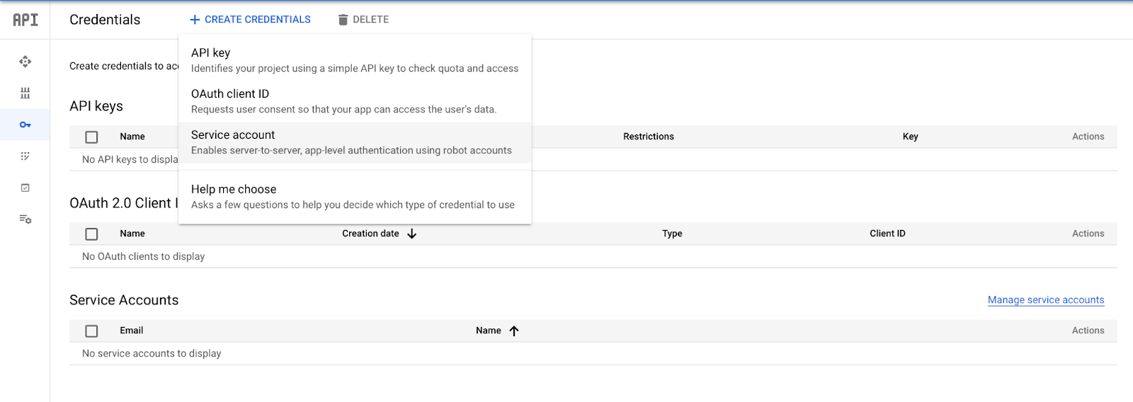 To set up BigQuery as your Airbyte destination, you will need to create a Service account with BigQuery Access. Login to GCP and go to the API–>Credentials page and create a new service account.