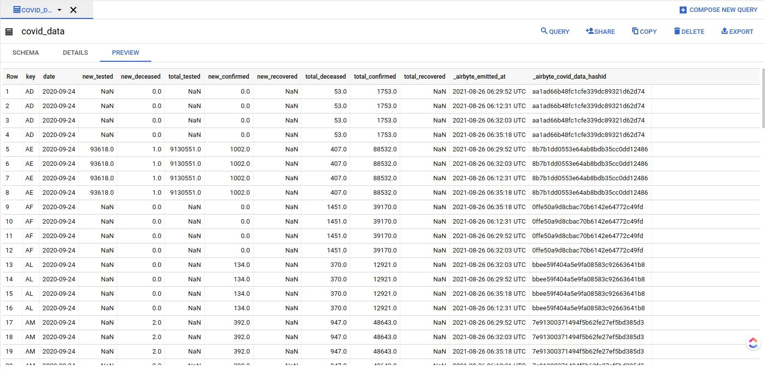 The _airbyte_raw_covid_data table contains the raw JSON emitted by Airbyte, which is then normalized to form the covid_data table. The cases view corresponds to the dbt model. You can take a look at the preview tab to get an idea of the covid_data table structure.