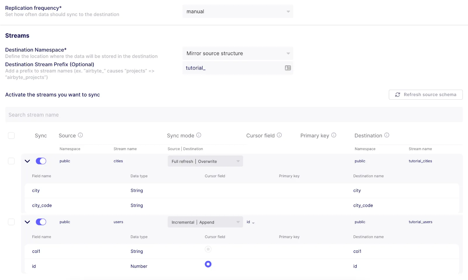Now, you should select a sync mode. I chose Full refresh | Overwrite to sync the cities table and Incremental | Append for the users table since it has an id column (primary key) suitable for the incremental cursor field. The most important thing to note is that you can have different sync modes for each table! Learn more about sync modes in our documentation.