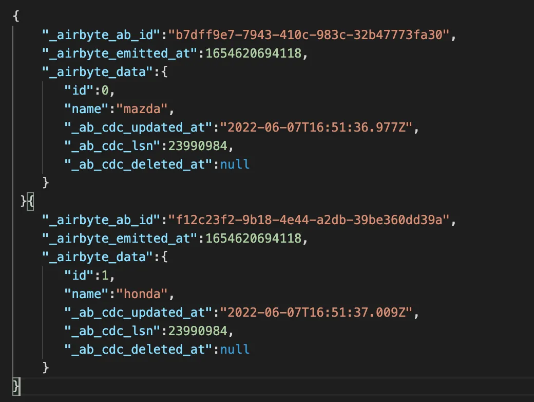 From the root directory of the Airbyte project, go to /tmp/airbyte_local/cdc_tutorial, and you will find a file named _airbyte_raw_cars.jsonl where the data from the PostgreSQL database was replicated.