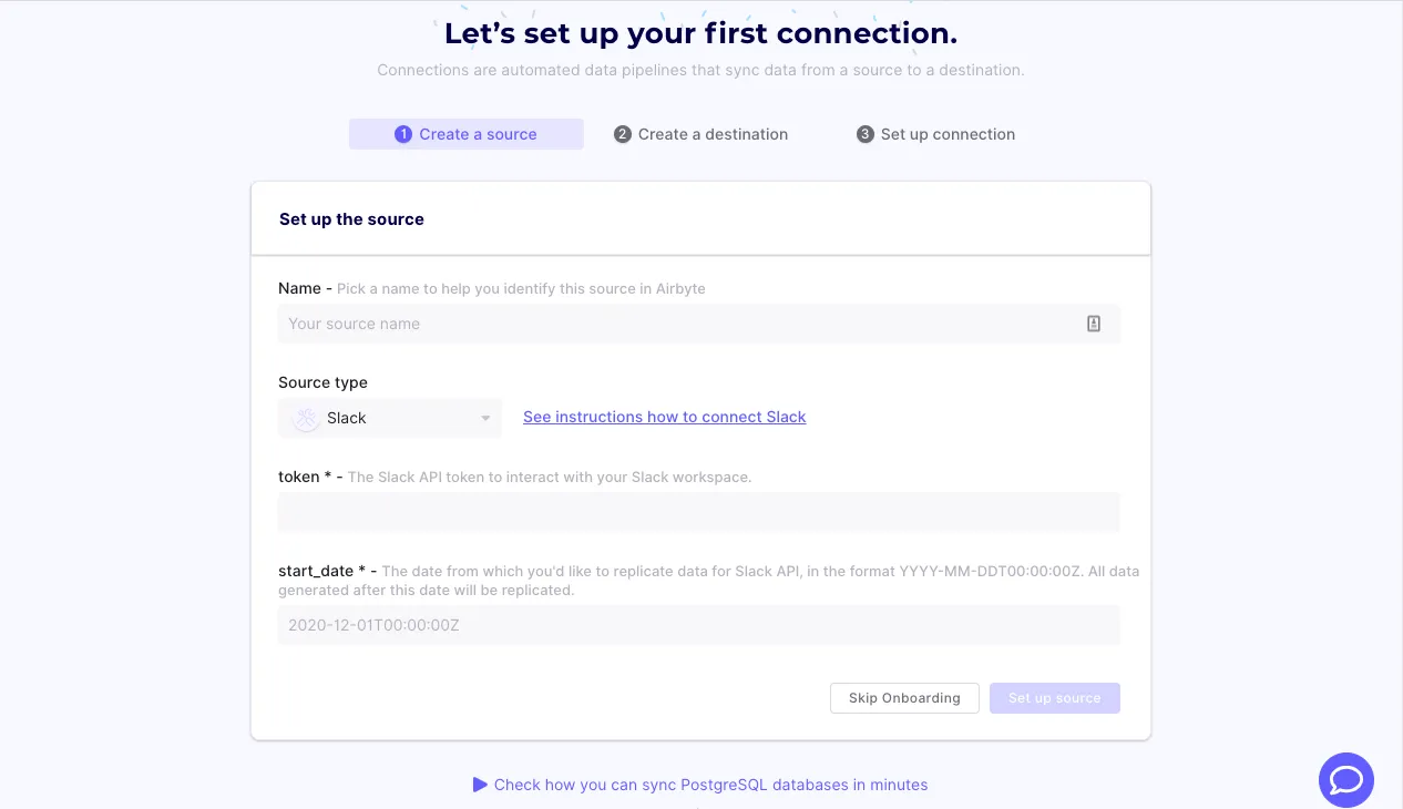 In the Airbyte UI, select Slack from the dropdown. We provide step-by-step instructions for setting up the Slack source in Airbyte here. These will walk you through how to complete the form on this page.