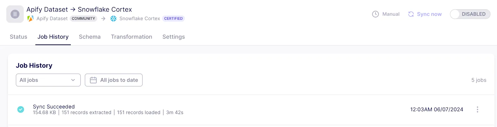 Now we can sync data from Apify_dataset to Snowflake Cortex