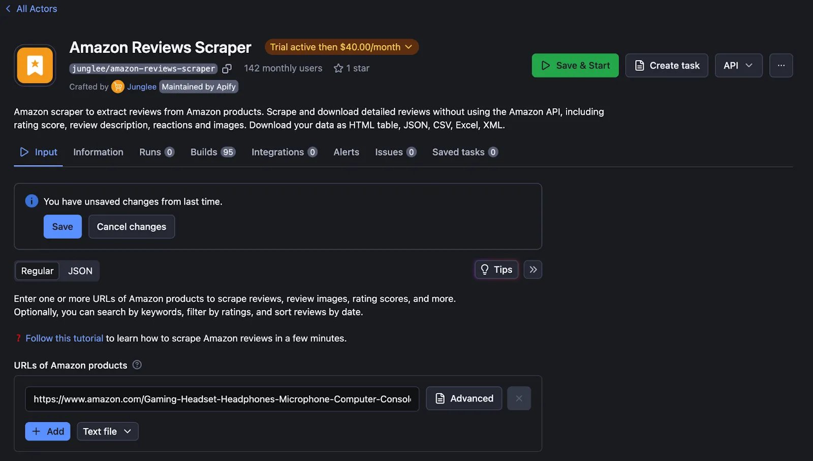 In the Apify console, search for the Amazon Review Scraper. Enter all the necessary details, including the URL of the product, any specific parameters for the review scraping, and any additional relevant information. Once all the required fields are filled out, save your settings and run the scraper.