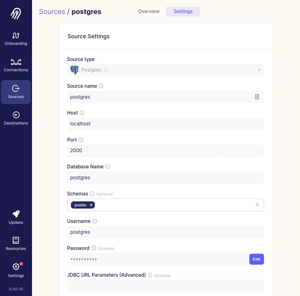Source and destination configurations have credential fields you want to store as something other than plain text. Octavia offers secret management through environment variables expansion on configuration files. You can set environment variables in your ~/.octavia file. Then you can reference these variables on your configuration files with ${POSTGRES_PASSWORD}. After editing the configuration, it should look like this: