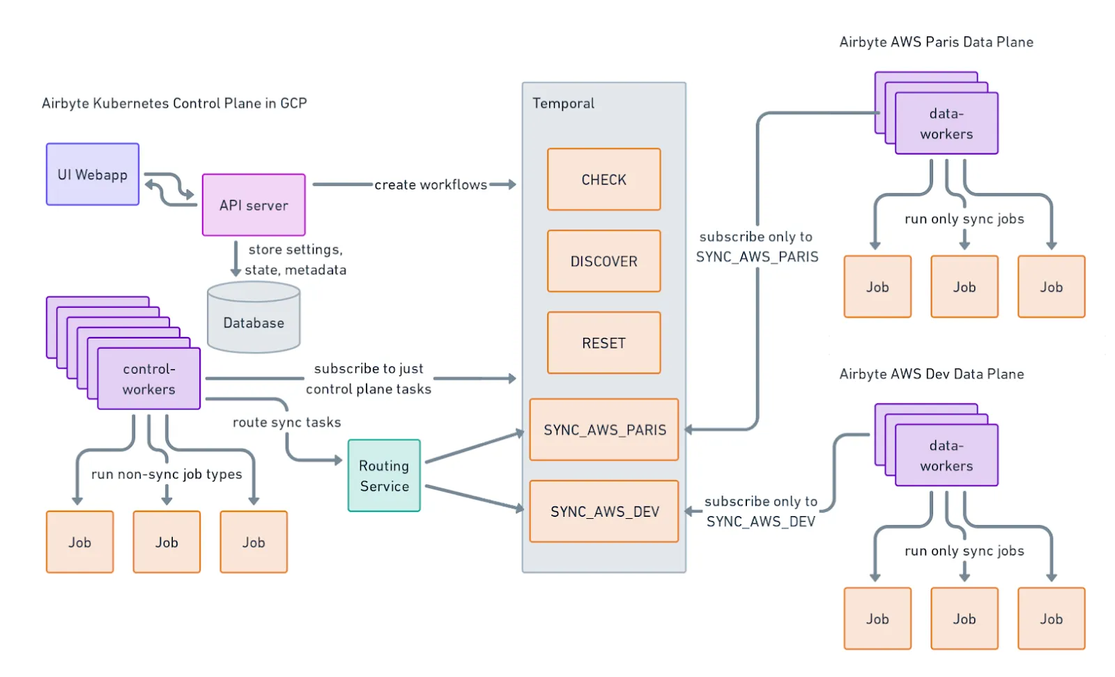 - The Data Plane - Airbyte’s Hands - are on the right. We see two planes. The first is in Paris, while the second is a temporary plane for development.