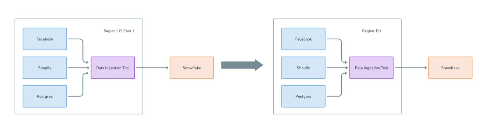 The second and more sophisticated approach is “Upgrade all infrastructure and processes to adhere to the new regulations” and do a lift-and-shift to the EU. For brevity, we skip the US and EU privacy law analysis and jump straight to a general data-aware strategy: move all data processing to the region with stricter data-privacy laws. This is the EU in this scenario. Compliance is ensured through making sure all data is compliant.